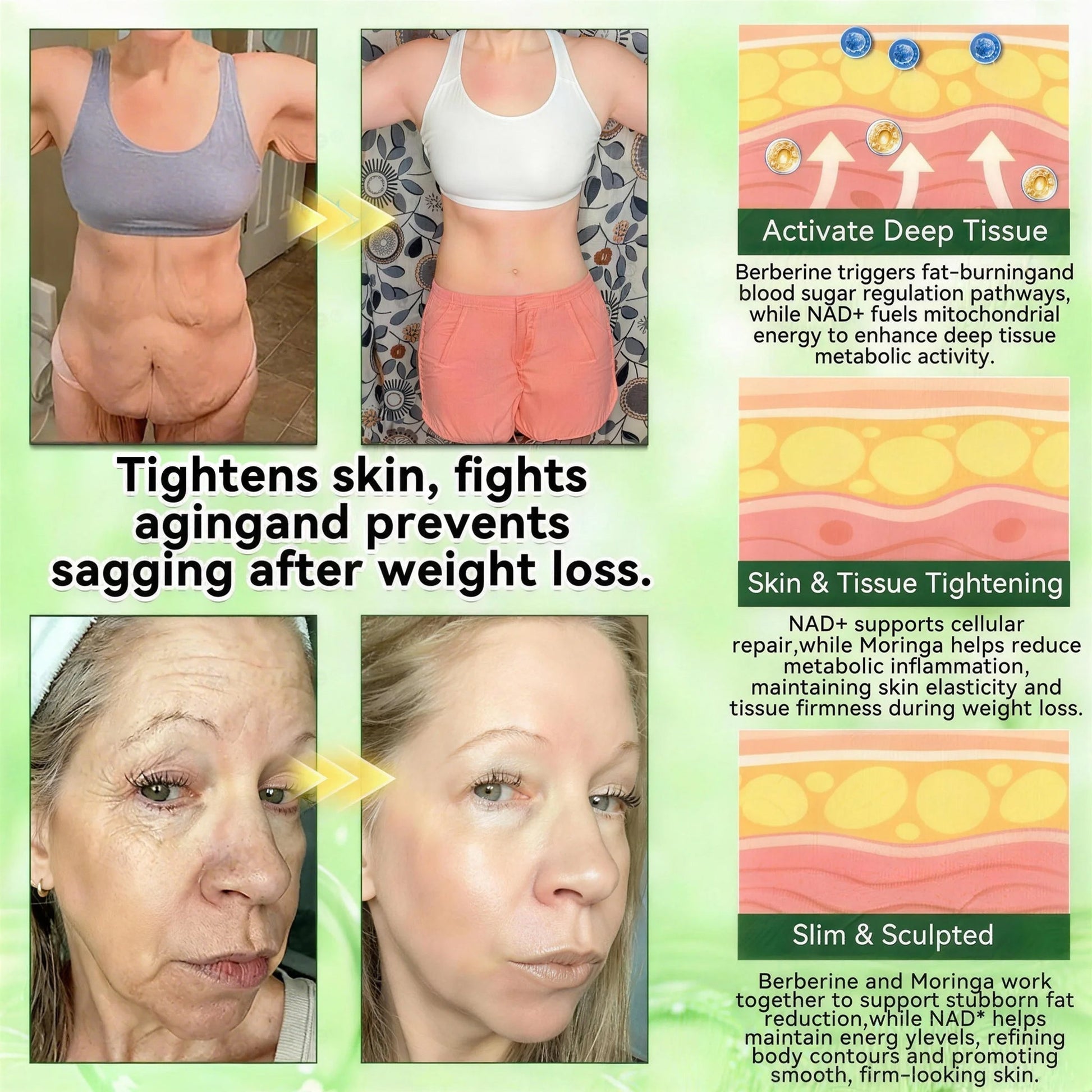 Benefits: Supports cellular energy levels and physical endurance, promotes cognitive function and mental focus, helps slow age-related cellular decline, and contributes to improved skin firmness and elasticity. Particularly beneficial for addressing skin laxity in areas such as the abdomen and arms following weight loss.